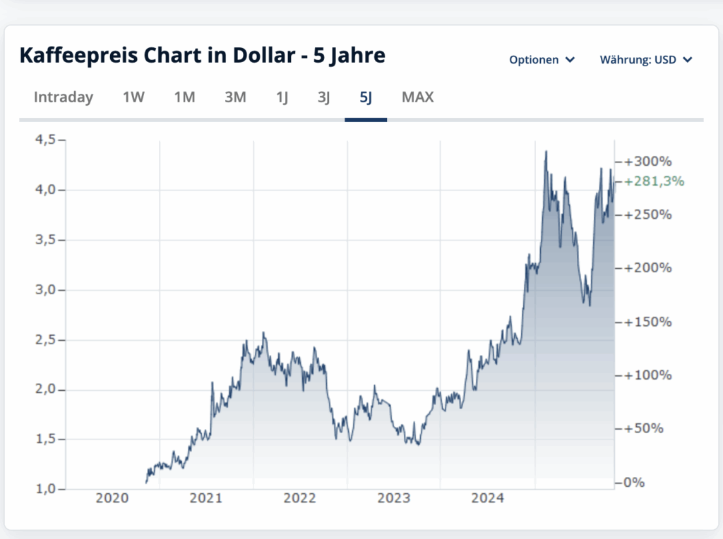 Schlechte Ernten, Störungen der Lieferketten, regulatorische Änderungen machen den Kaffee teurer. An der New Yorker Rohstoffbörse wird Arabica so hoch gehandelt wie seit fast 50 Jahren nicht mehr. Auch Robusta hat in 2024 Rekordpreise an der Börse erreicht.